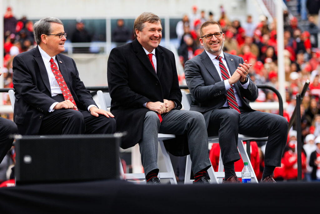 Once the team got into the stadium, the formal celebration began. Former star running back D’Andre Swift had the honor of calling the Dawgs before the festivities really began. On and around the stage on Dooley Field were the players, the coaches, UGA President Jere W. Morehead, J. Reid Parker Director of Athletics Josh Brooks, Gov. Brian Kemp and SEC Commissioner Greg Sankey, and more.