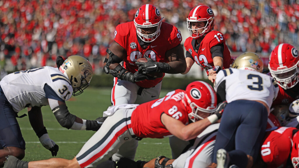 The Bulldogs’ home finale featured a pregame sendoff of the team’s large group of seniors, including nose tackle Jordan Davis. A finalist for both the Outland and Bronko Nagurski trophies as one of the top linemen in the country, the 6-foot-6 and 340-pound Davis plunged into the end zone from the 1-yard line for Georgia’s first score of the game.