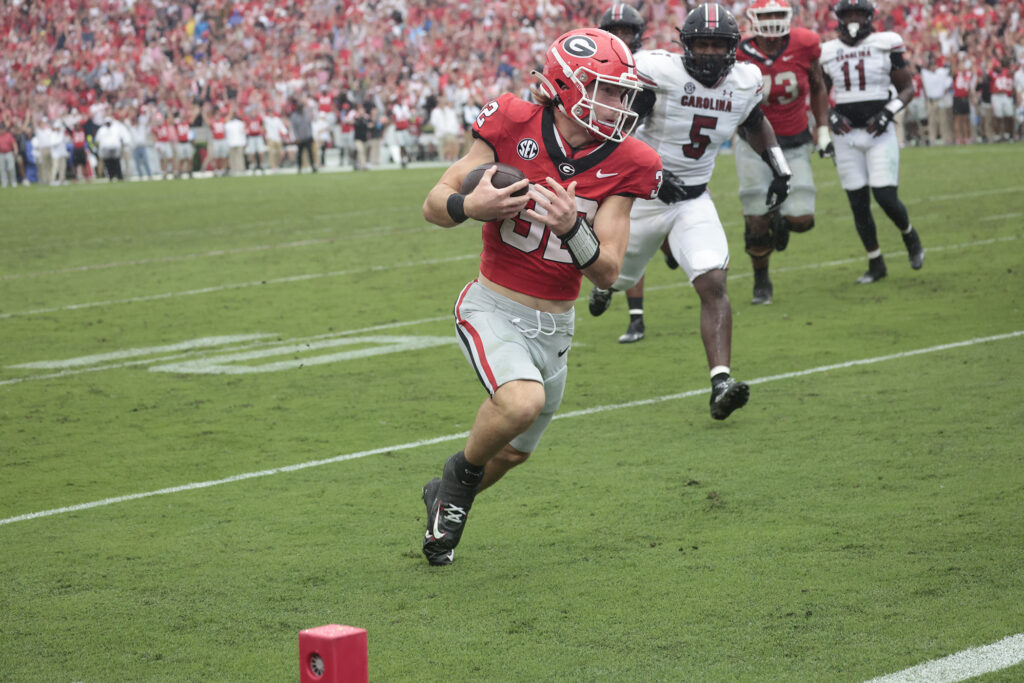 Quarterback Carson Beck was 13 of 18 for 98 yards in the first half, and finished the game 27 of 35 for 269 yards. The Bulldogs outgained the Gamecocks (1-2, 0-1) 458 to 309 in total yards, including a 189-53 advantage on the ground.