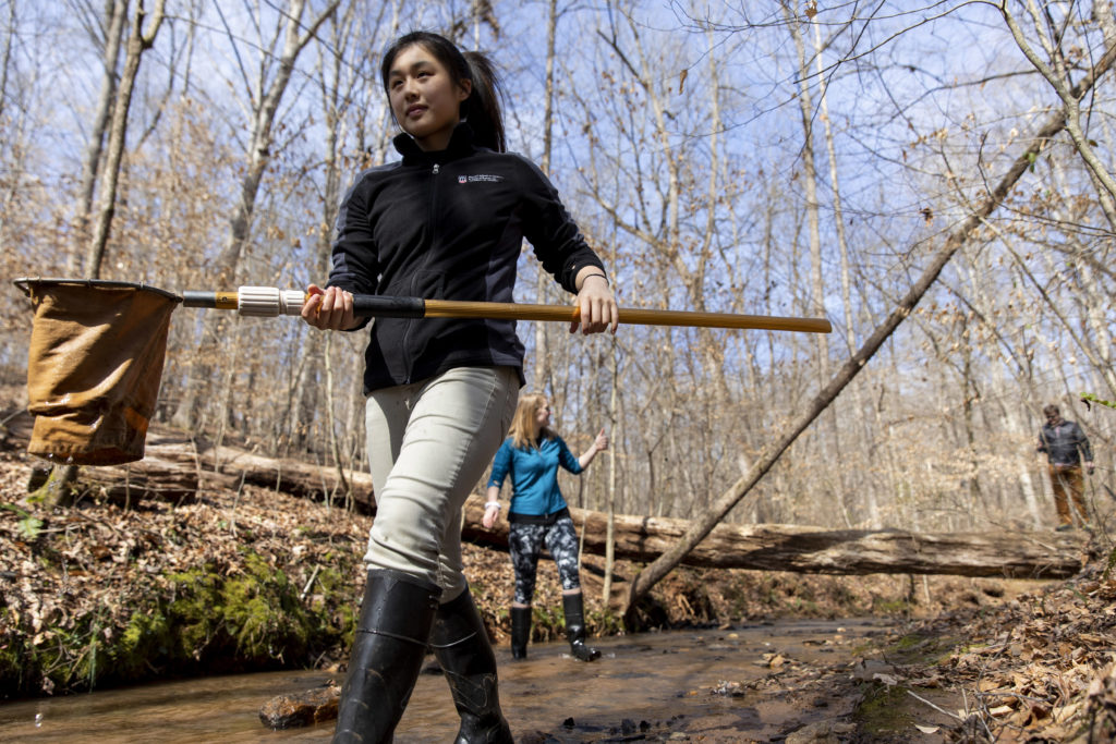 For a semester-long stream project, UGA students in Ecology 3500 designed their own original studies involving observing and measuring ecological processes in the Orange Trail stream at the botanical garden, a UGA Public Service and Outreach unit. They conducted field research this week.