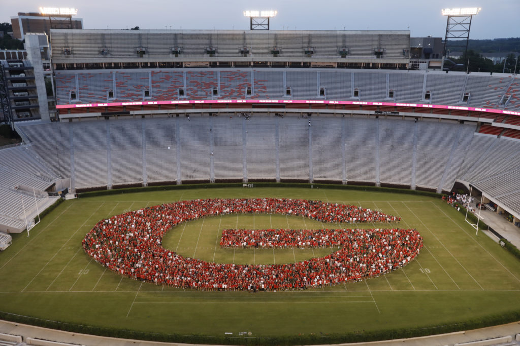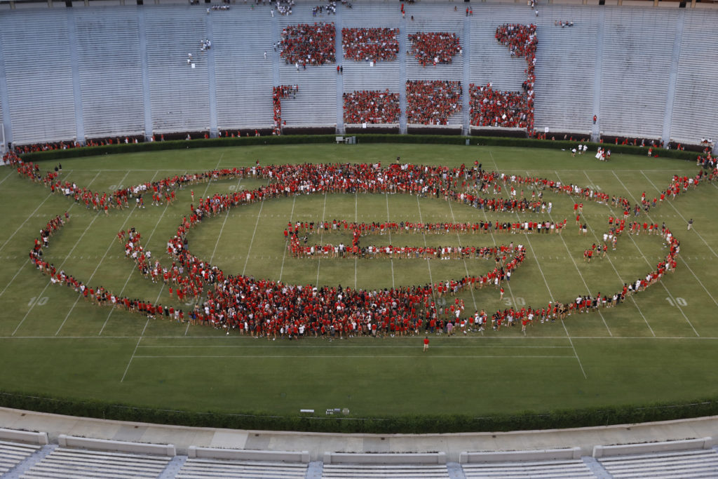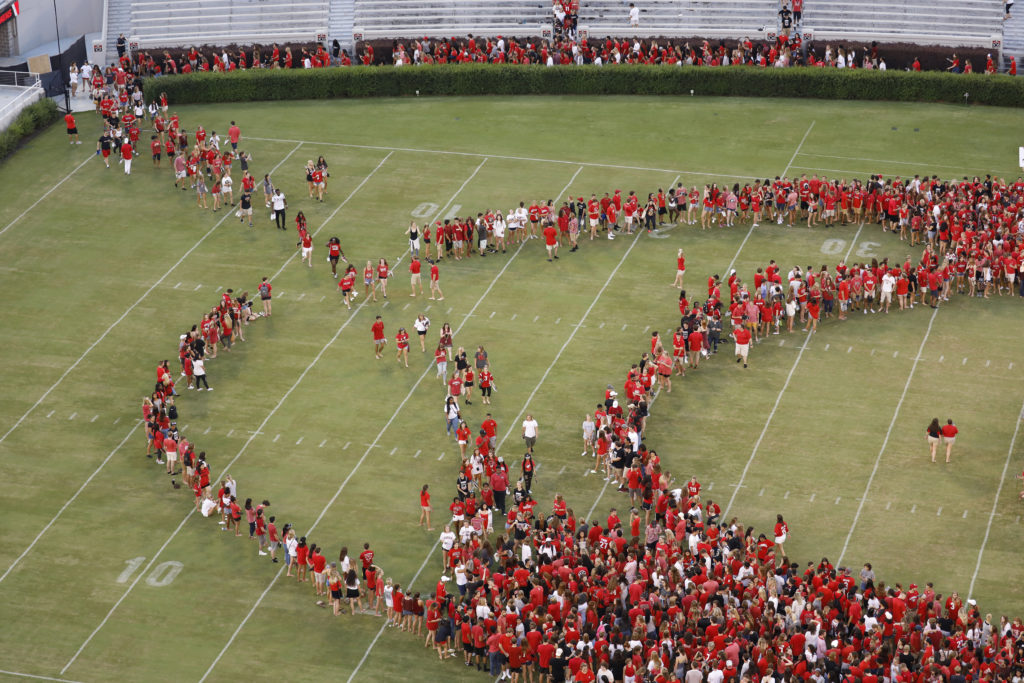 Incoming students in the Class of 2022 formed the “power G” under the Sanford Stadium lights and between the hedges for Sunday’s Freshman Welcome. Along with other activities, the students heard from President Jere W. Morehead and football coach Kirby Smart. (Photos by Chad Osburn and Andrew Davis Tucker/UGA)