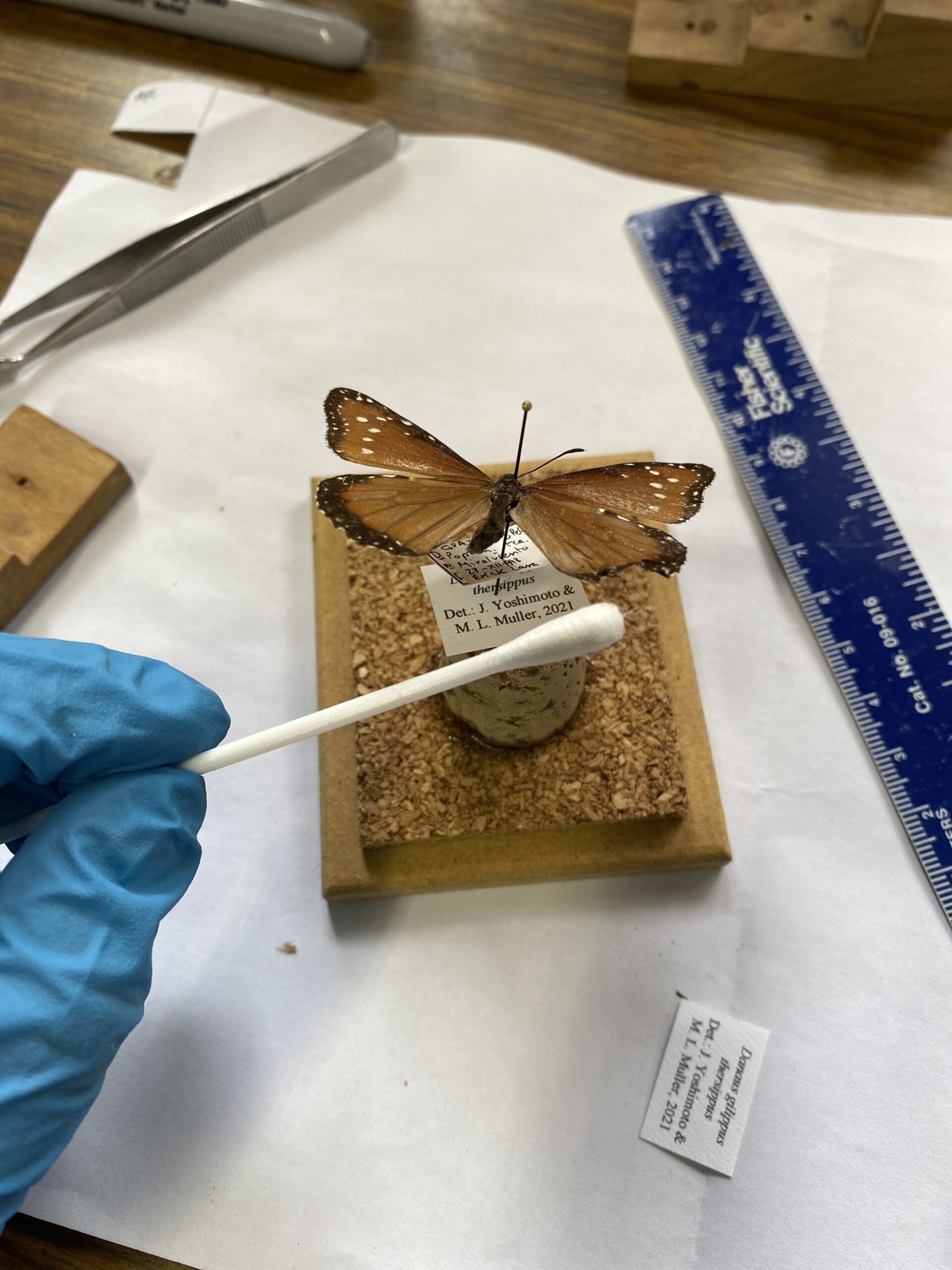 When butterflies are infected with OE, spores of the parasite appear on the outside of their bodies. The researchers collected samples by carefully twisting a fiber swab against the body and sampling the butterfly’s scales. The scales can then be transferred to a glass slide and examined under a microscope.
