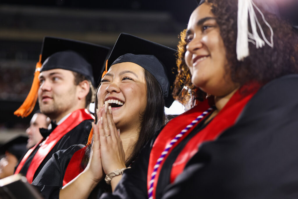 The evening undergraduate ceremony was capped by a rousing rendition of “Georgia on My Mind” performed by Gabriella Lauren All, an Honors student from Savannah double majoring in piano performance and chemistry, that brought the crowd to its feet, as well as a fireworks show over the stadium.