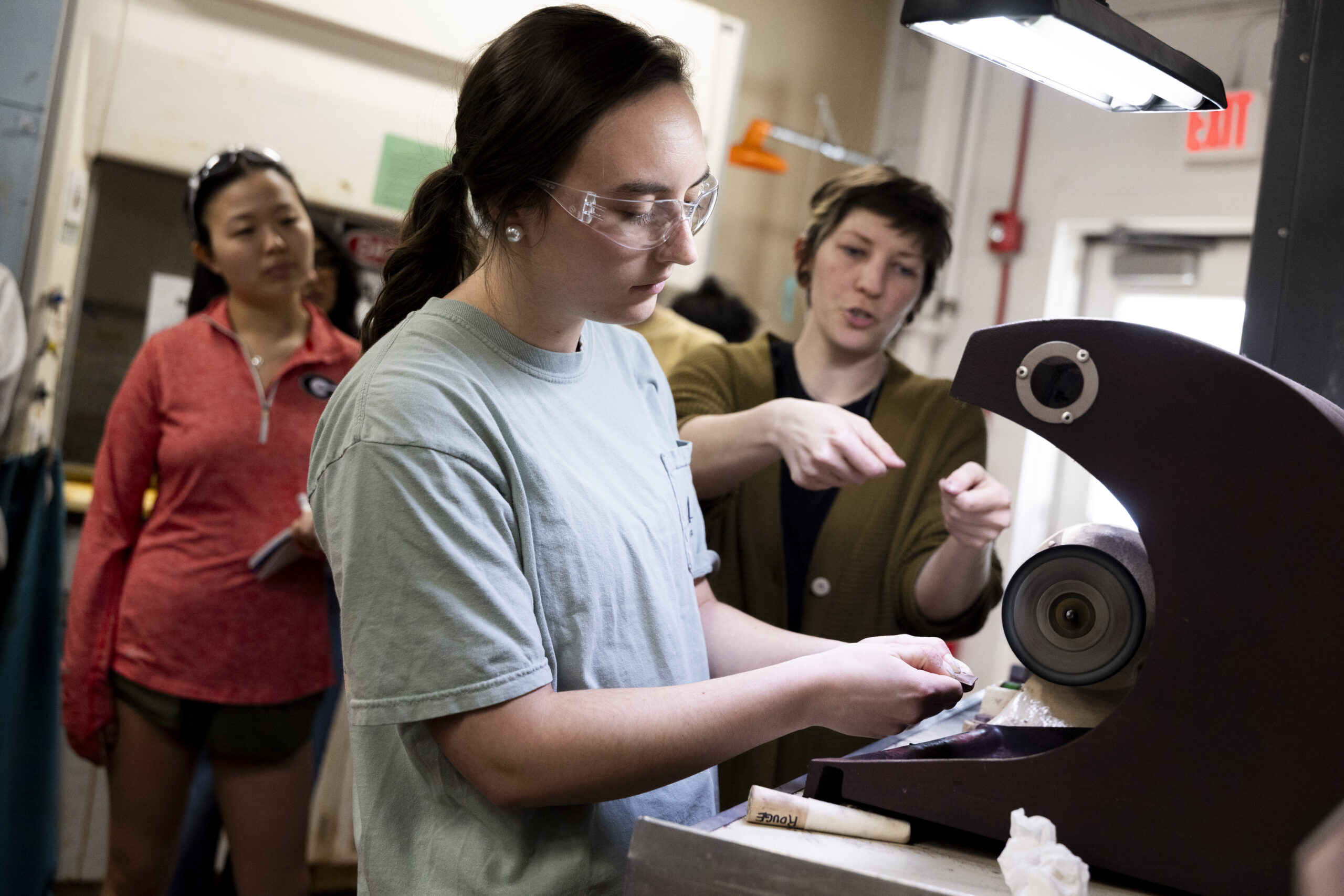 Undergraduate student Maddy Hyde is shown how to use the polishing wheel by jewelry and metalwork instructor Leah Mazza in a session for pre-dentistry students. The students are completing the art-dental certificate program to help improve their manual dexterity, a key skill for dentists. (Photo by Peter Frey/UGA)