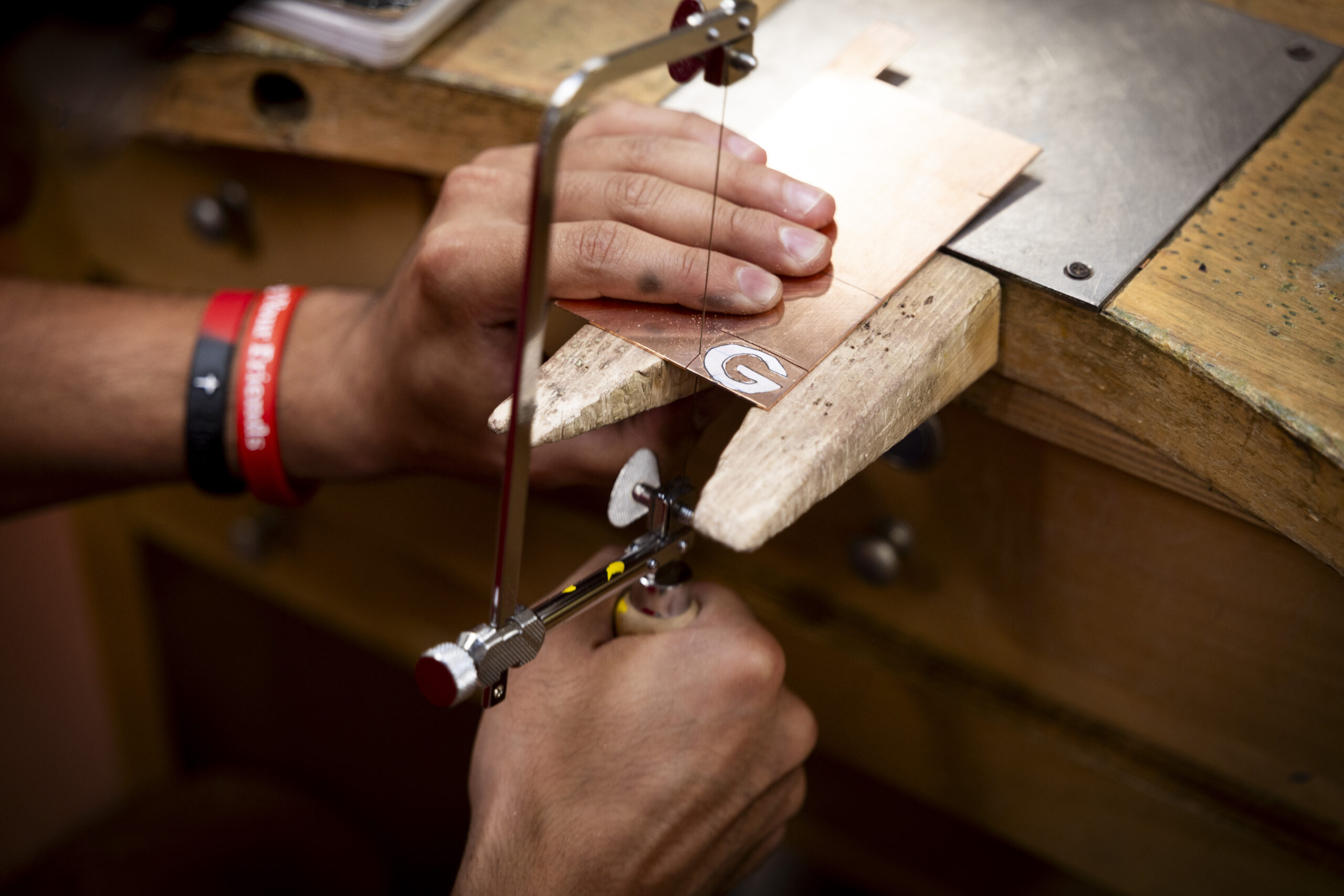 Pasha Kohzadpour uses a jewelers saw to cut out the “Power G” in copper for the piece he is working on in the Manual Dexterity Through Art non-credit certificate program. The students are doing a series of art sessions in ceramics, jewelry and metalwork, and printmaking to help improve manual dexterity for their future careers as dentists. (Photo by Peter Frey/UGA)