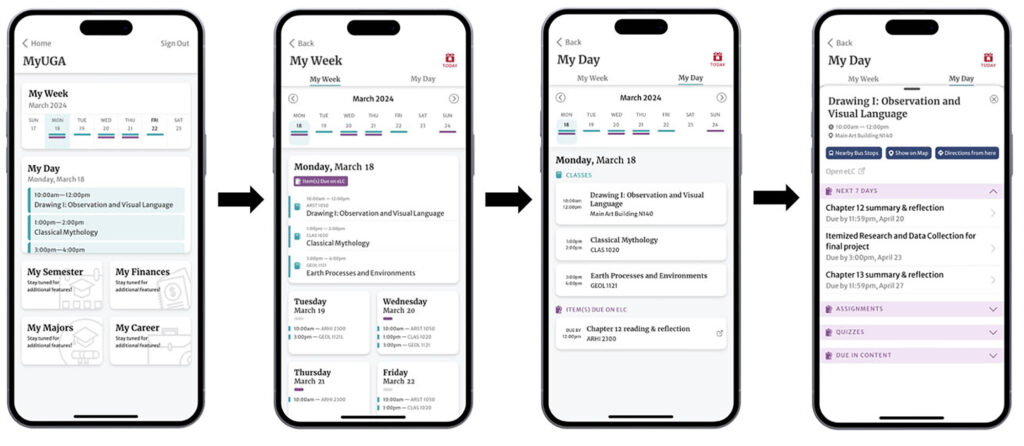 The eLC integration to the UGA Mobile App is part of a multi-phase improvement plan where the EITS Web and Mobile Technology team has worked to expand the user experience for students, making the UGA Mobile App a one-stop shop to help students increase productivity by streamlining our services.