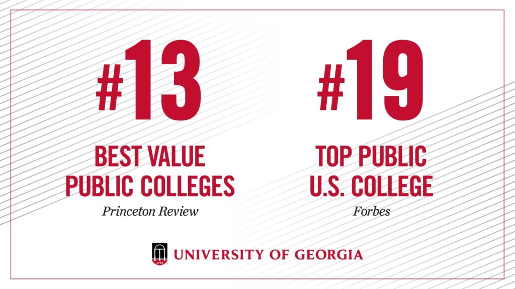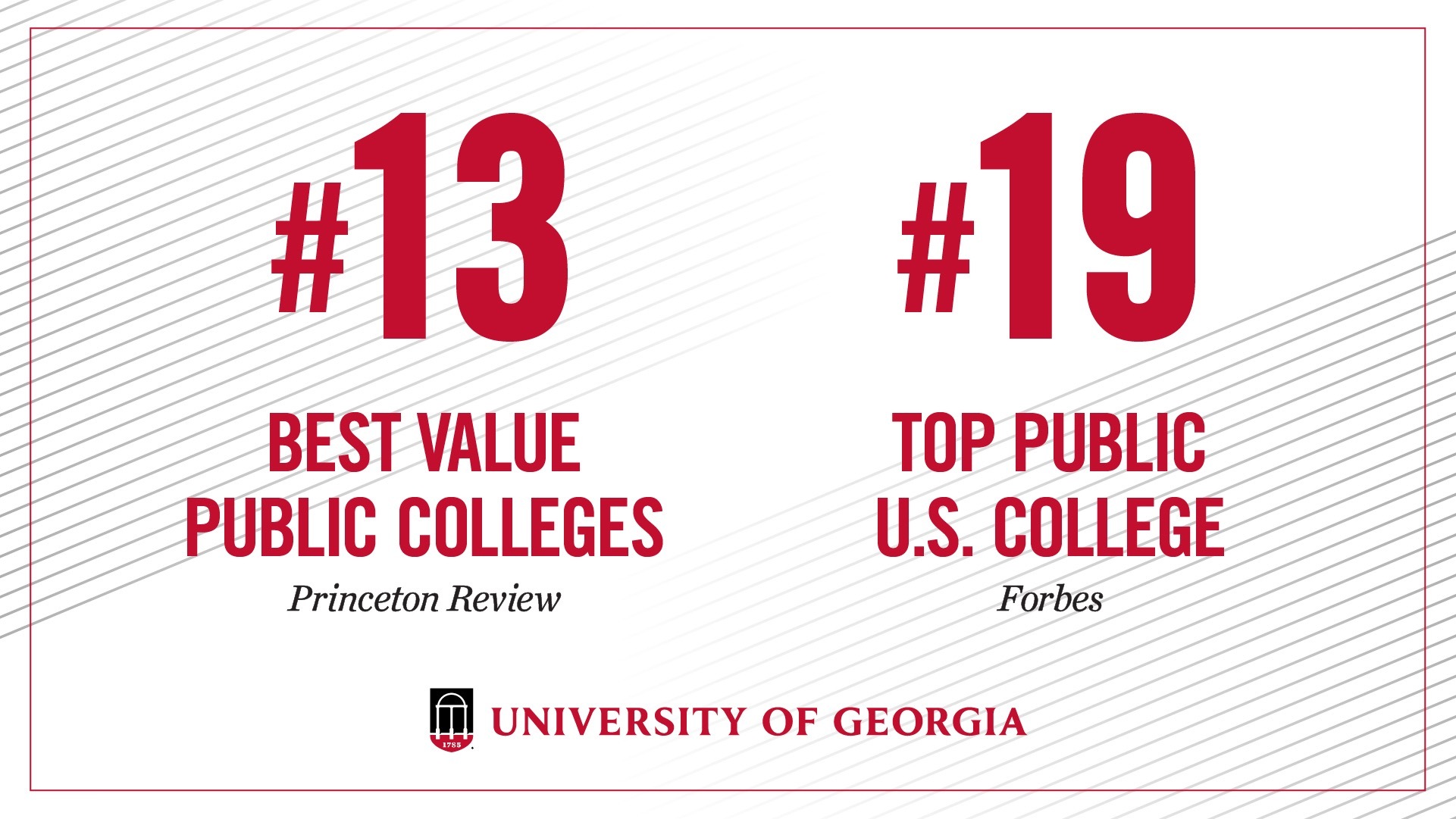 Forbes recently ranked UGA No. 19 nationally among public universities, up two spots from its previous ranking last year. Forbes also ranked UGA No. 13 among universities in the South, and the institution ranks highly on Forbes’ lists of best research universities, best employers and best value.