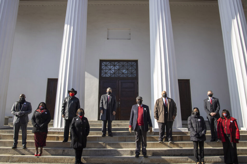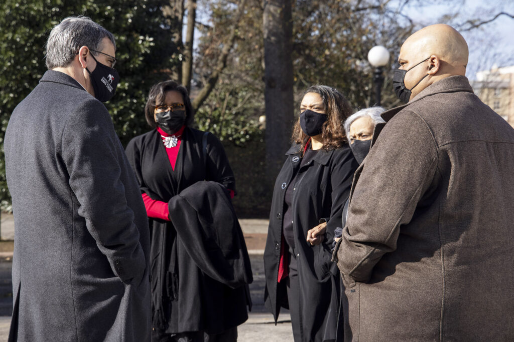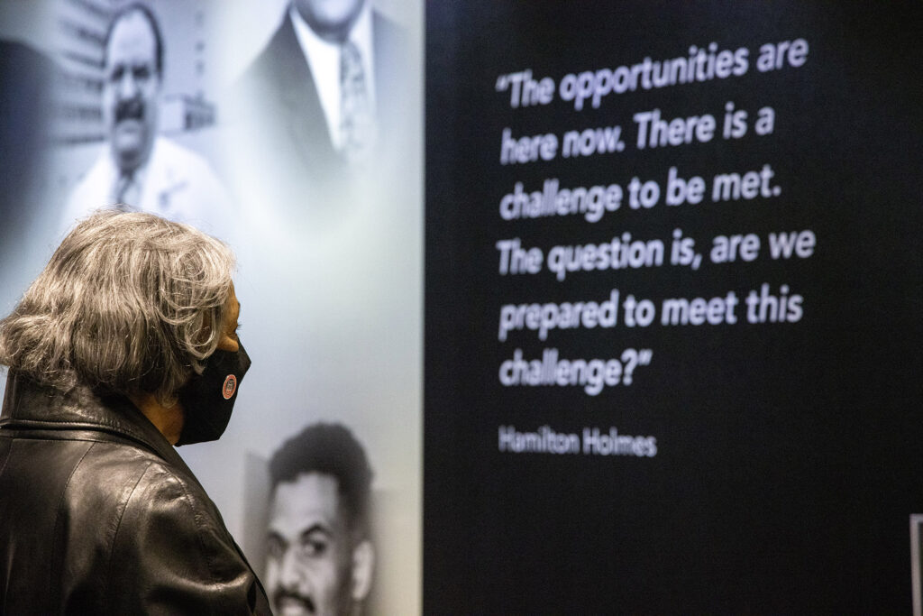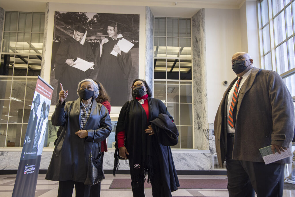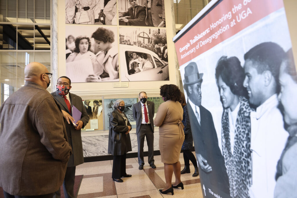 Honored guests, including the Holmes family and members of the UGA Black Alumni Council, were among the first to tour the exhibit, “Georgia Trailblazers: Honoring the 60th Anniversary of Desegregation at UGA,” on the day it opened, Jan. 9, 2021, the 60th anniversary of Holmes’ and Hunter’s enrollment.